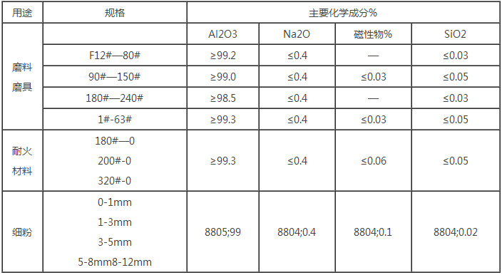 白剛玉以工業(yè)氧化鋁粉為原料,于電弧中經(jīng)2000度以上高溫熔煉后冷卻制成,經(jīng)粉碎整形,磁選去鐵,篩分成多種粒度,其質(zhì)地致密、硬度高,粒形成尖角狀,適用于制造陶 瓷、樹(shù)脂固結(jié)磨具以及研磨、拋光、噴砂、精密鑄造(精鑄專(zhuān)用剛玉)等,還可用于制造耐火材料 。